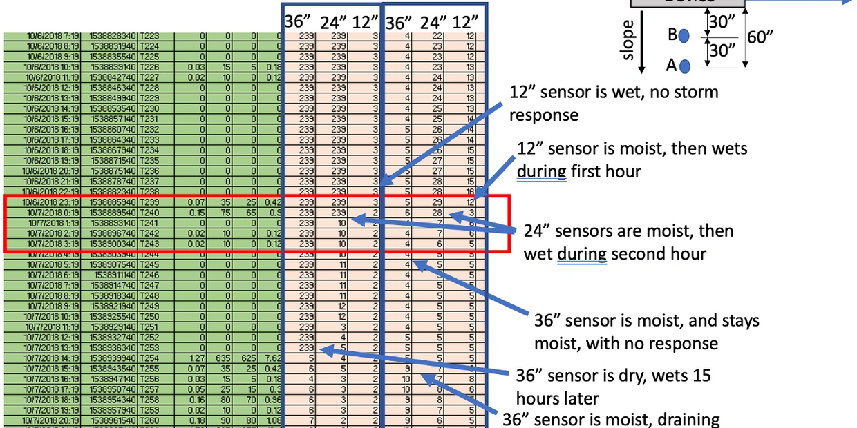 By comparing rainfall (green section) to soil moisture readings (pink section) we can see how rainfall impacts soil moisture over time around the Infiltech device to get an understanding for how the Infiltech® system of devices works. The 12", 24", and 36" columns represent sensor depths in a sensor stack (multiple sensors placed directly over or under each other below ground). The three left pink sections are one stack, A, and the right three pink sections are one stack, B. From this data we can understand vertical and transverse movement of water below ground. If we also look at sensor stacks placed farther left or right of these stacks we can interpret longitudinal flow. This data can show us trends, but can be very noisy due to site conditions such as lifts of different fill material. This method allows for comparison and insights into how water is moving around a site, but it is a slow comparison process and there is no way to visualize what is happening site wide.