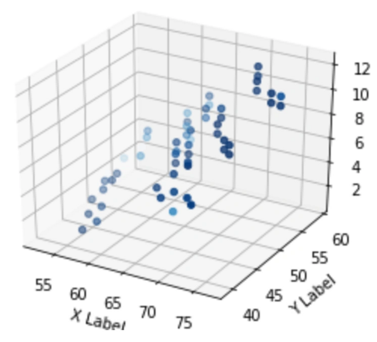 To try and remedy some of the shortcomings of the previous two methods a Python program was written and GIS, survey, and soil moisture data were combined to plot soil moisture data for every sensor on a site for a particular time, in space. On these plots, like the one pictured above, the soil moisture correlates to the darkness of the shade of blue, with dark blue being wetter and light blue being drier. A variety of these plots can be compared very quickly to understand how soil moisture is changing on a site over time, where on a site water goes to at different times, and how an installation as a whole manages water.